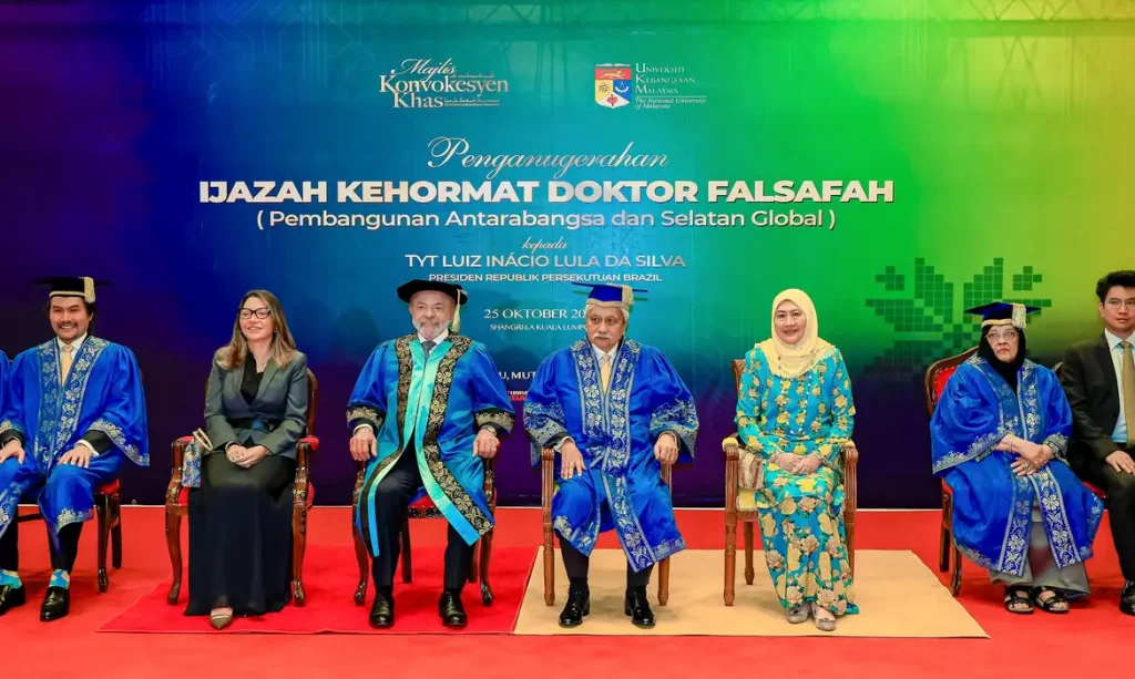 O presidente Luiz Inácio Lula da Silva voltou a criticar a continuidade da guerra em Gaza e a resistência mundial em criar um Estado palestino. A declaração foi dada neste sábado (25), durante a cerimônia de recebimento do título de doutor “Honoris Causa” em Filosofia e Desenvolvimento Internacional do Sul Global, concedido pela Universidade Nacional da Malásia, em Putrajaya, capital administrativa da Malásia.