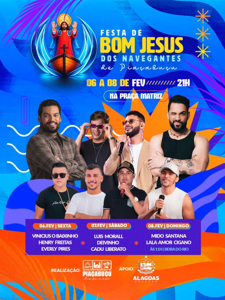 A Festa de Bom Jesus de Piaçabuçu chega com uma programação especial, reunindo grandes nomes da música e um cenário que traduz a identidade do nosso povo. Os shows acontecerão na Praça da Matriz, a partir das 21h, garantindo noites de muita animação e emoção. 🎶✨